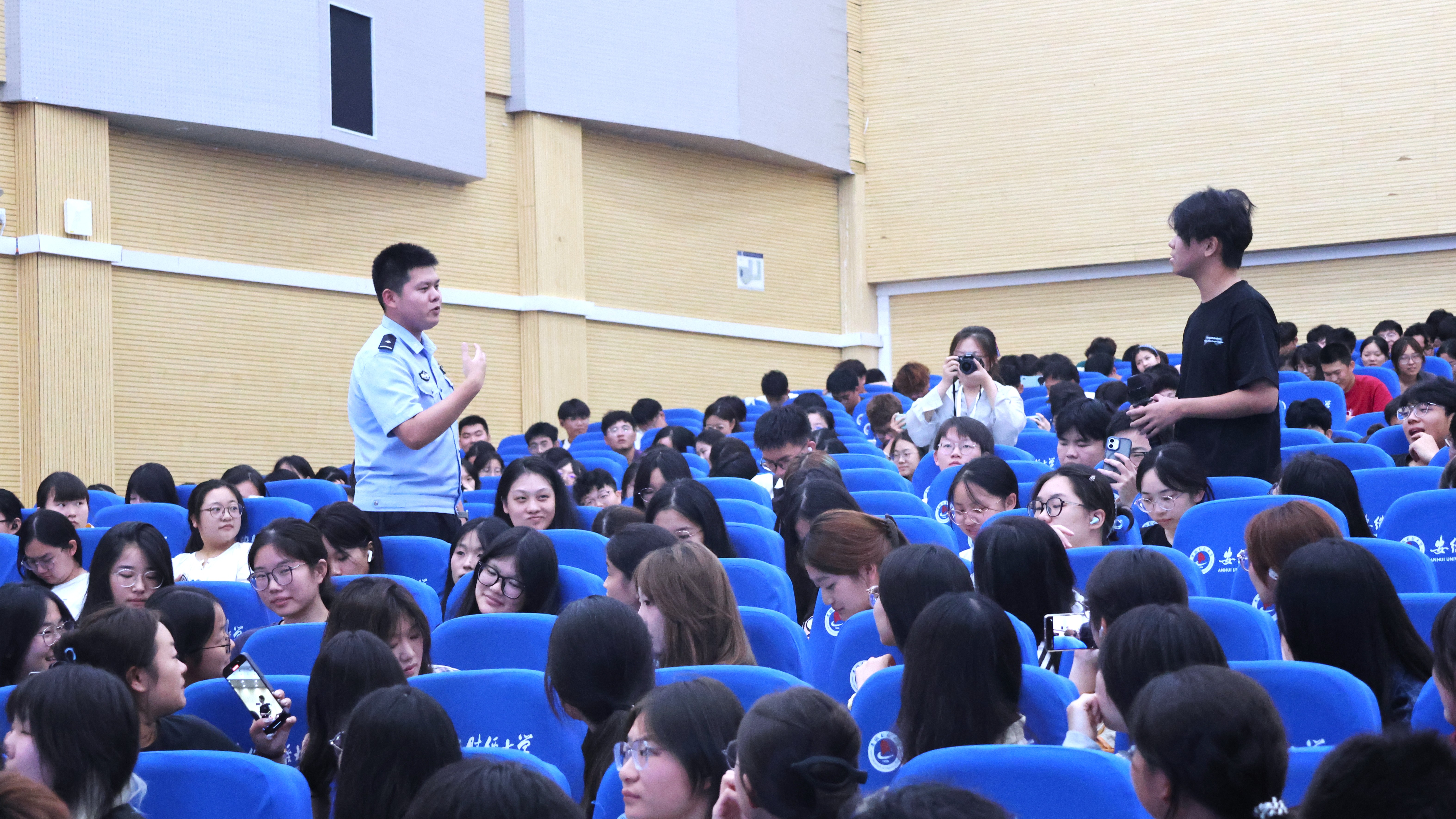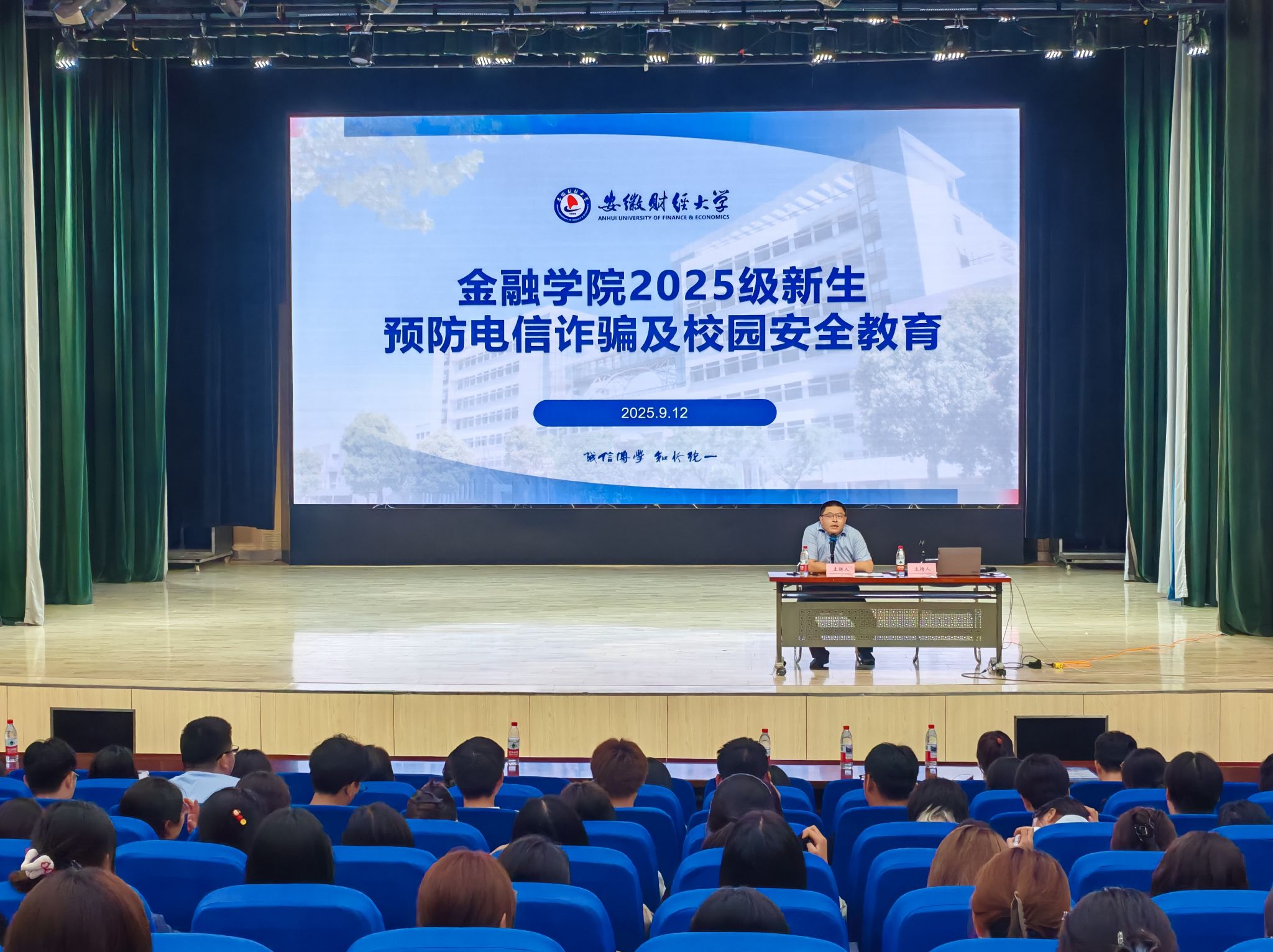 为帮助2025级新生树立正确的安全观,增强学生法律素养和自我保护能力,构建平安、和谐、稳定的校园环境,9月12日晚,招生就业于艺术楼报告厅举行“2025级新生安全教育专题讲座”。本次讲座特邀蚌埠市反电信网络诈骗中心专业民警和反电诈宣传专员担任主讲嘉宾。学院党委副书记邹炎、团委书记谢涛、全体2025级本科新生、研究生新生及辅导员共同参加本次活动。